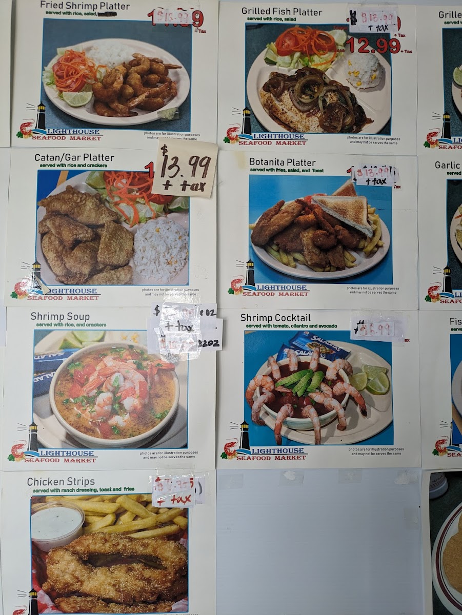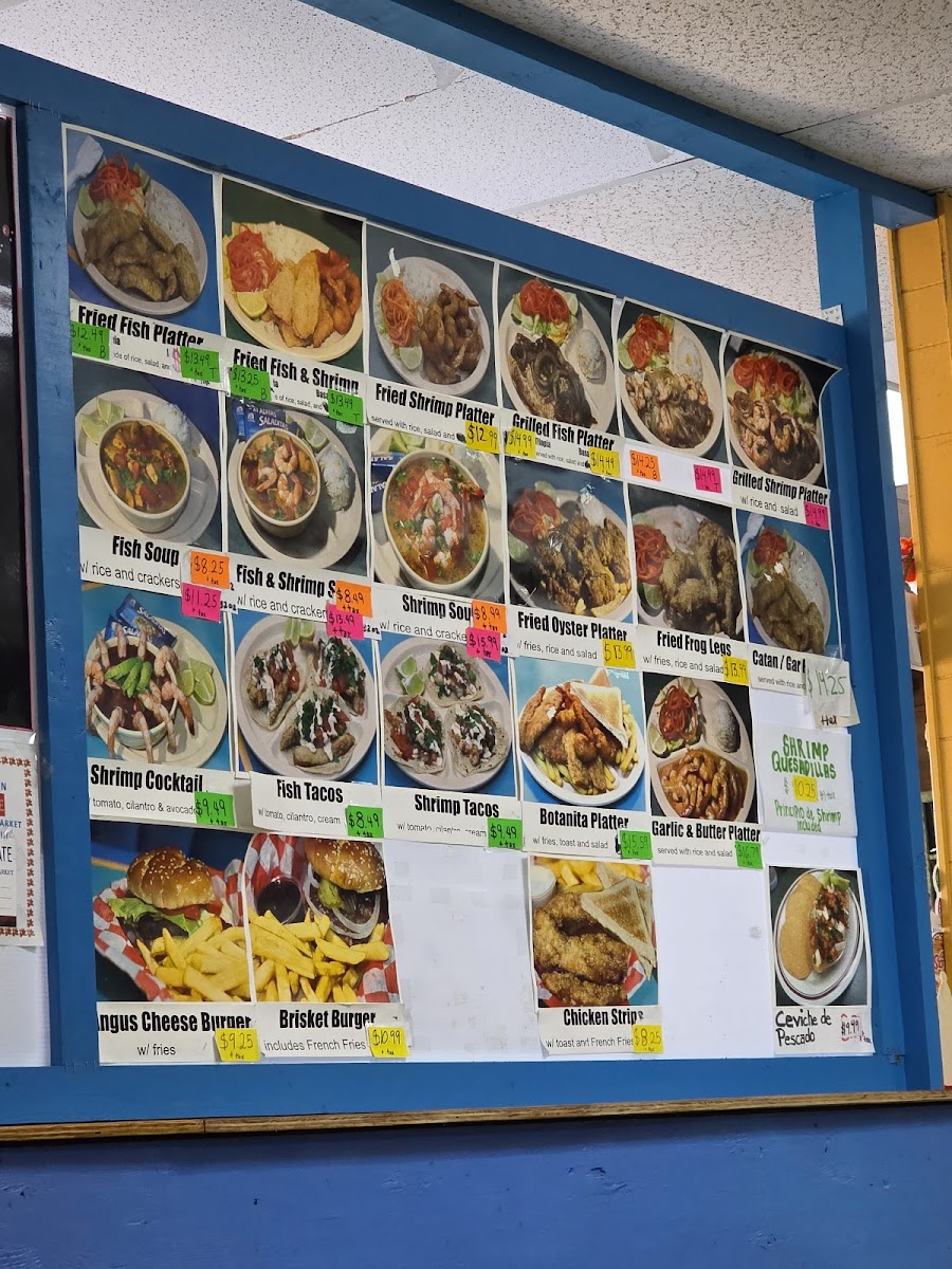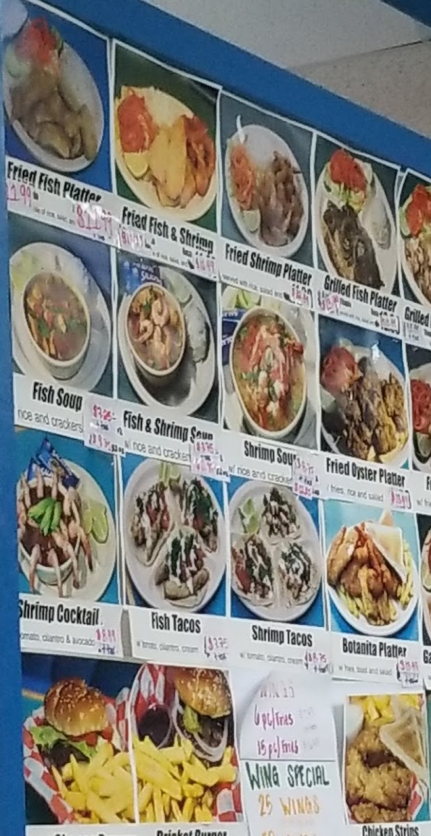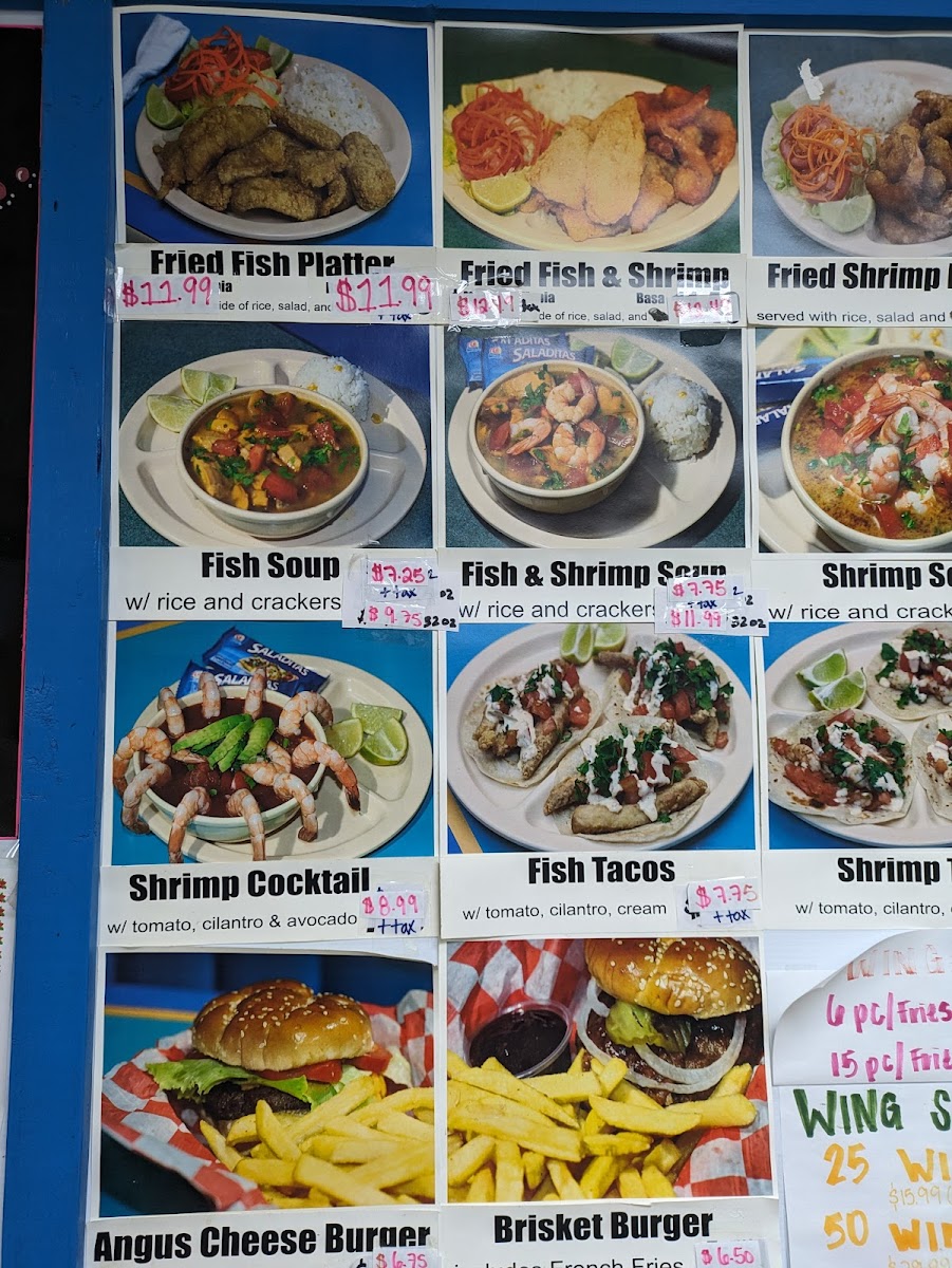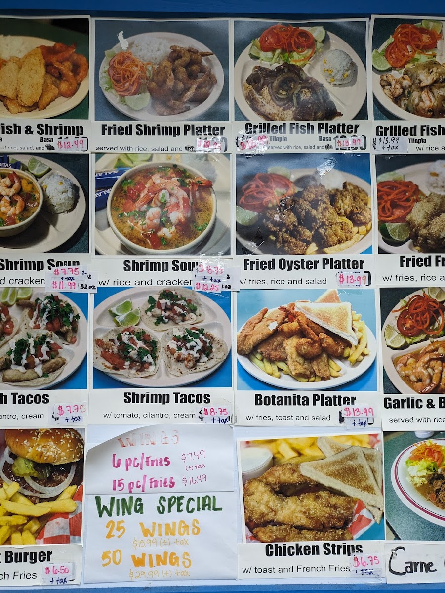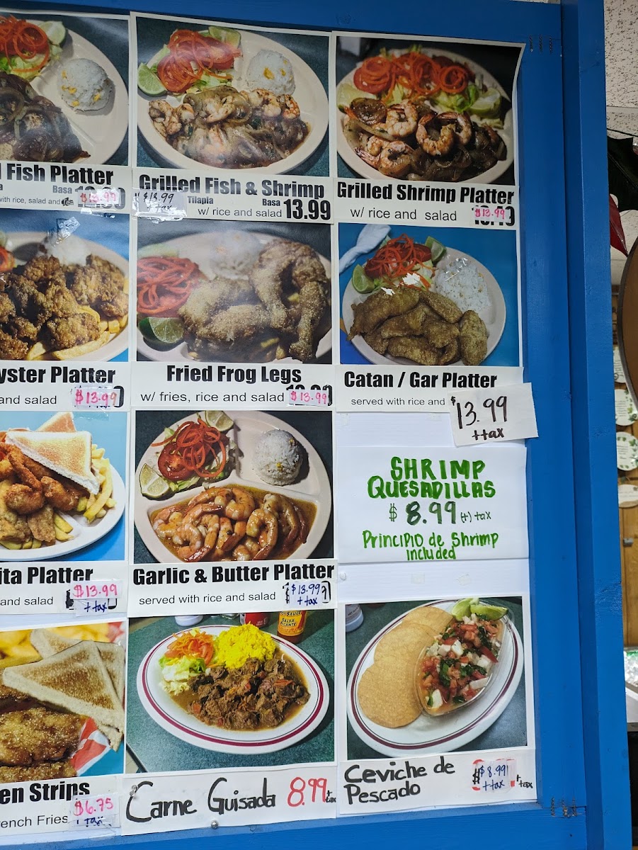 Fish and shrimp cooked in oil. Platter served with rice, salad, free ice tea or lemonade.